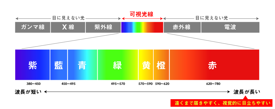 赤は、光の中でも波長が長く、視界の中で強く届きやすい色です。私たちが日常生活で「色」として認識しているものは、光の波長によるものです。その中でも、人間の目が感知できる範囲の光を可視光線スペクトルと呼びます。赤色は可視光線スペクトルの中で最も波長が長い色であり、その特製のおかげで遠くまで届きやすく、視覚的に目立ちやすいという特徴があります。そのため人間の視野に入ると、