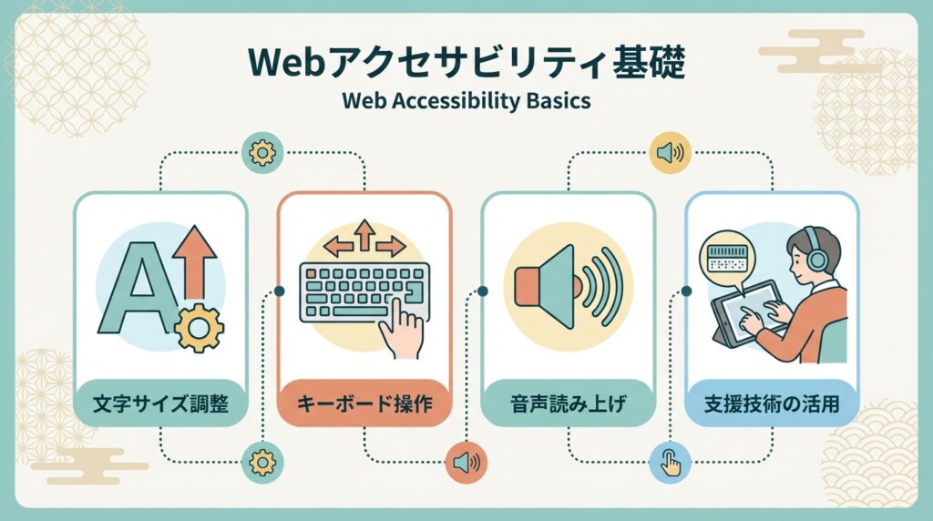 Webアクセシビリティとは、年齢・障がいの有無・利用環境に関わらず、誰もがホームページを利用できる状態を指します。