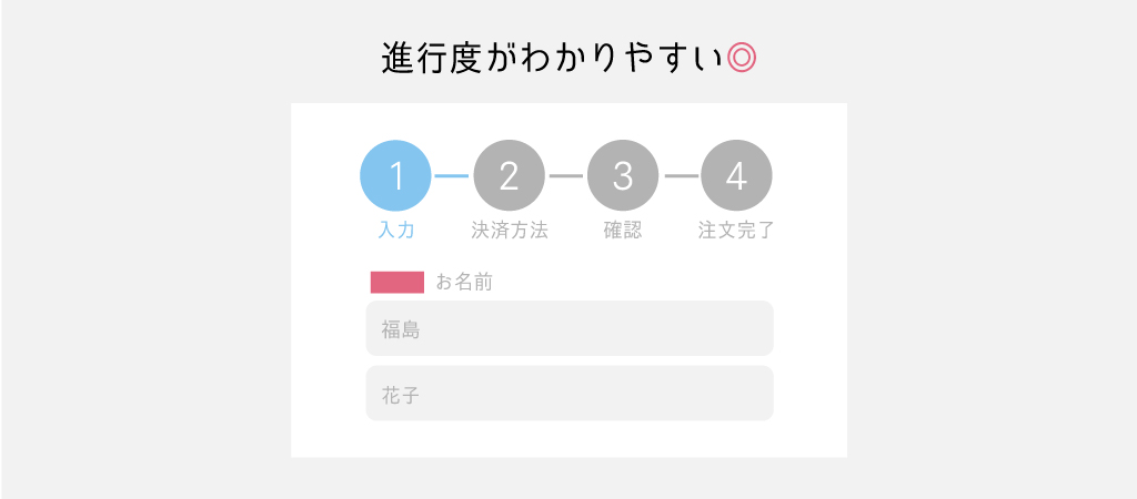 STEP表示などで進行状況が目に見えていると、ユーザーは無意識のうちに安心し、次の操作に進みやすくなります。