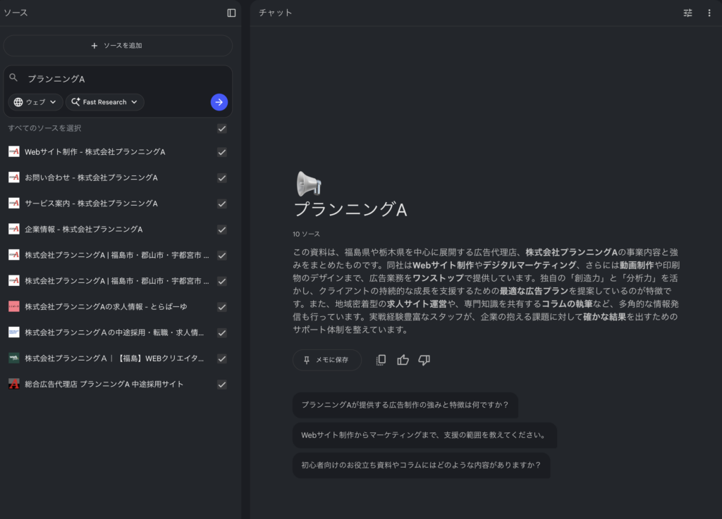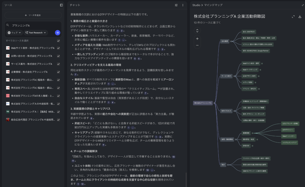 過去数年分のプレスリリース、商品カタログ、社長インタビューのPDFなどをまとめてNotebookLMに読み込ませます。あとは「自社の強みを3点にまとめてください」「〇〇事業の歴史を時系列で教えてください」と聞くだけです。
