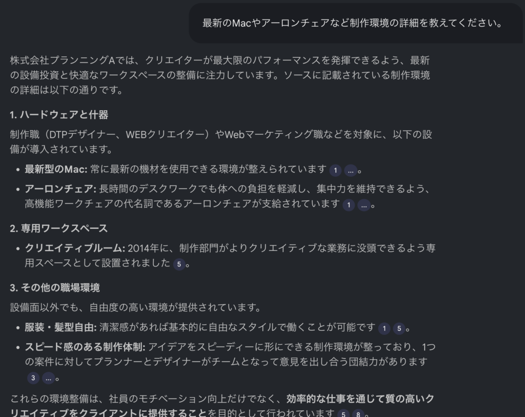 たとえば「自社の強みを3点まとめてください」と入力すると、AIが各ポイントの根拠として「過去の資料」「WEBサイト」「商品カタログの仕様表」など、具体的な出典を示してくれるのです。